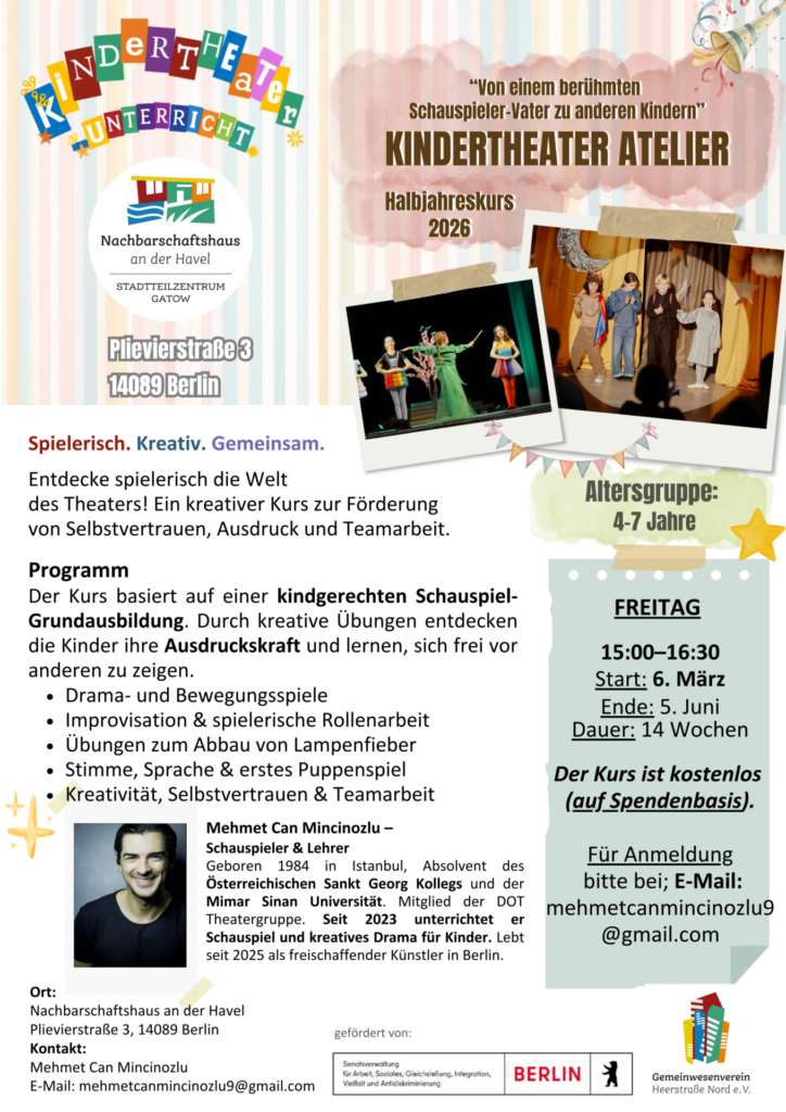 Der Kurs wird von einem erfahrenen Schauspieler und Theaterpädagogen geleitet und findet als Halbjahreskurs über mehrere Wochen statt.
