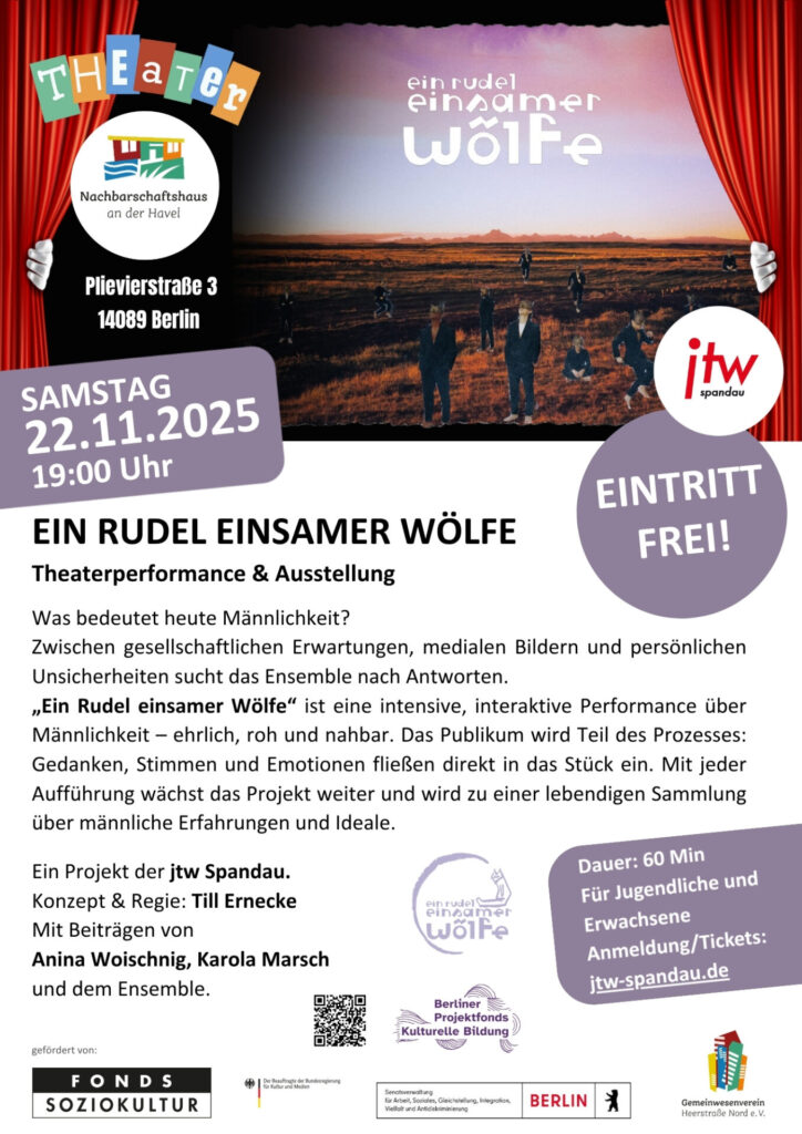 Am Samstag, den 22.11.2025, findet abends um 19 Uhr die Theaterperformance „Ein Rudel einsamer Wölfe“ statt. Das Stück behandelt das Thema Männlichkeit richtet sich an Jugendliche und Erwachsene und ist ein Projekt der Jugentheaterwerkstatt Spandau (jtw Sandau). Der Eintritt ist frei. Um Voranmeldung wird trotzdem gebeten unter: post@jtw-spandau.de oder bei Serkan Öz: oez@heerstrasse.de .